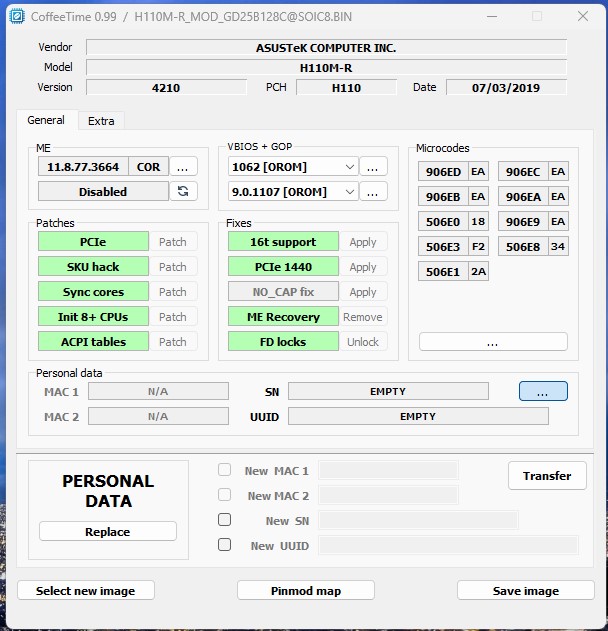 Модифицированный дамп биоса на основе оригинальной версии 4210 материнской платы ASUS H110M-R, для запуска Xeon 1270V5, а так же других процессоров Coffee Lake 8xxx/9xxx (содержит микрокоды 906ED, 906EC. 906EB, 906EA, 506E0, 906E9, 506E3, 506E8, 506E1) Считан и записан в микросхему программатором XGecu T48
