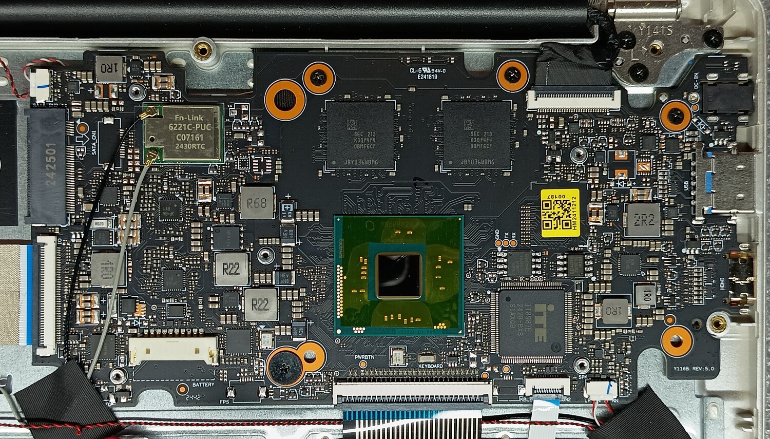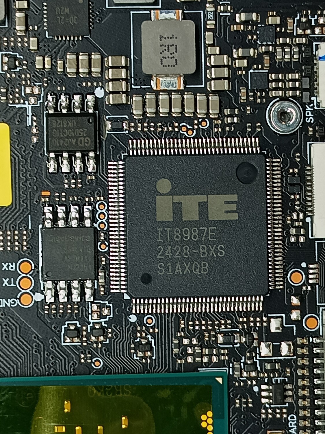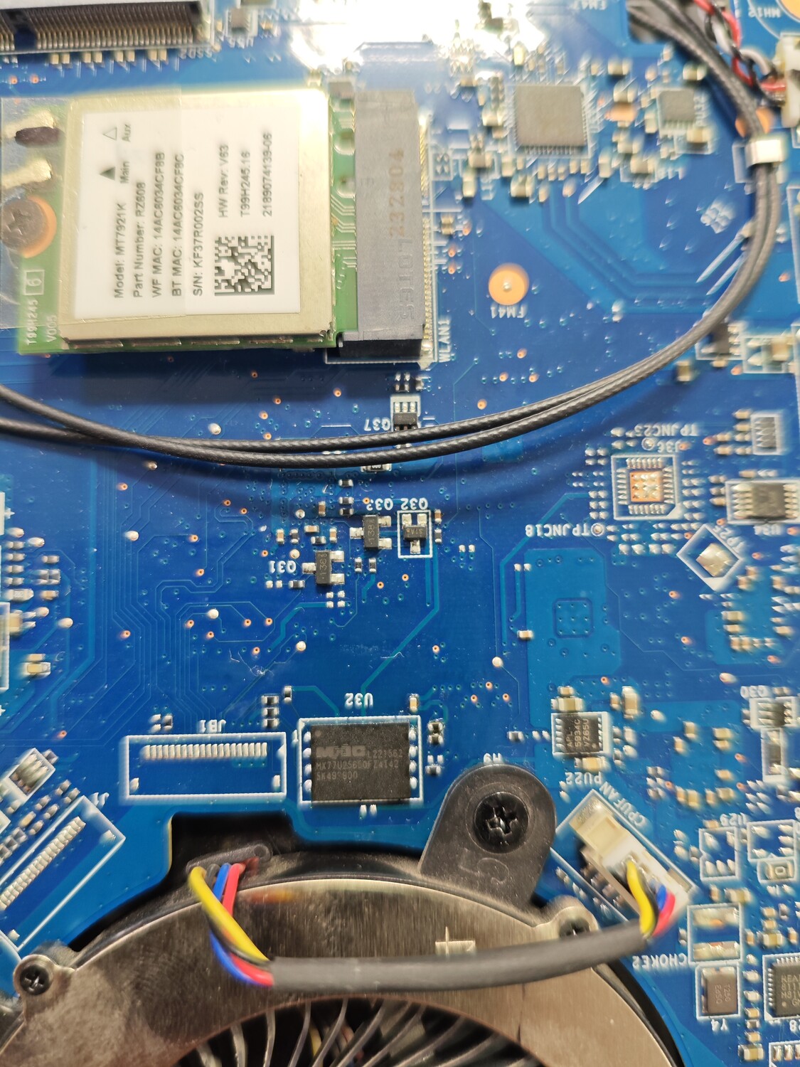 Пришел ноут, сам выключается, при разных обстоятельствах. После недолгих манипуляций выявили виновника - залитая клавиатура (кнопка включения на ней, но ноут включался на любую клавишу, кроме кнопки PWR ON). Отключили клавиатуру, для старта замкнуть кратковременно на разъёме клавиатуры два крайних контактов слева (снята задняя крышка, аккум сверху). Дамп bios без исправлений, версия 1.28.