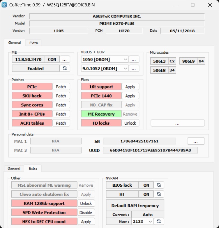 С оригинальными прошивками всё понятно. Распишу про патч: 1. Добавлены всевозможные микрокоды процессоров 1151v2 + разблокированы функции поддержки 6-8 ядерников 2. Оставлены родные микрокоды процессоров 1151v1 3. Патч на 128 ГБ ОЗУ (вместо родных 64) 4. Отключена проверка ME региона 5. Обновлены версии VBIOS и GOP 6. Применены прочие патчи, существующие в CoffeeTime 0.99