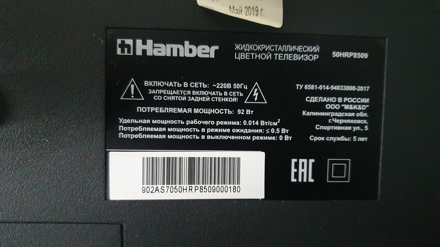HAMBER 50HRP8509 серийник 902AS70 Шасси (Main Board): TP.MT5522S.PC822
