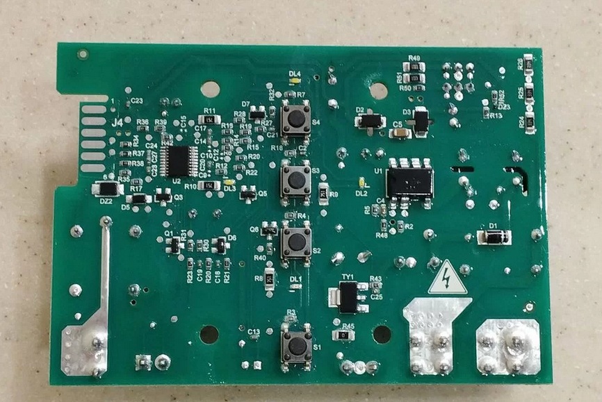 Умирает при пробое провода идущего на утюг , на плате нет никаких защит входа датчика температуры от повышенного напряжения.
