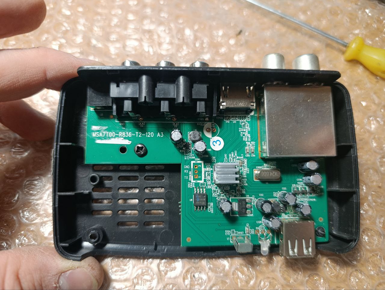 Здравствуйте! DiViSat HOBBIT IRON III с процессором Ali M3821 и внешней памятью, тюнер MXL608. Загружается и показывает картинку, но не ловит каналы и по UART выдаёт следующее: