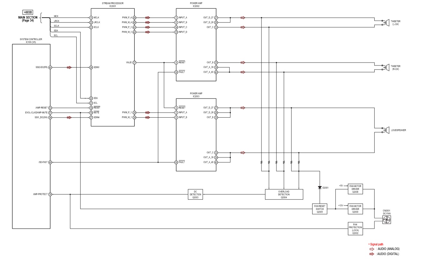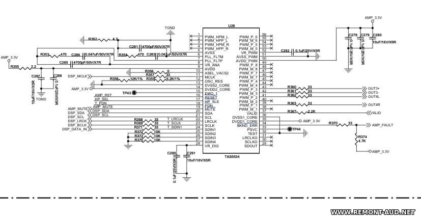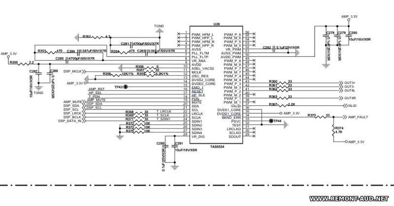 Уважаемые мастера, поучите уму разуму, пожалуйста. Есть такая же колонка, работает, но звука нет совсем, ни щелчка, ни шороха. Если правильно понимаю показания своего игрушечного ослика-конструктора на TAS5534 приходит цифровой сигнал по линиям SDIN3, SDIN4 (динамично меняющаяся картинка с частыми меандрами). Питание есть: DVDD 3.3V, AVDD 3.3V. Reset 3.3V, Mute 3.1V. SCL (всплески с равной периодичностью) LRCLK (богатая картина меандров) SCLK поднимается ~ 2V но без меандров, ни на TAS5534, ни выходе процессора, даже если отрезать линию, чтобы замерить "в воздухе" На выходах с TAS5534 тишина, никакого сигнала.