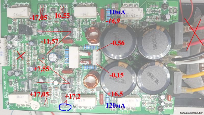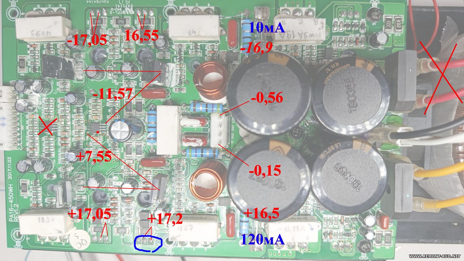 Спасибо всем откликнувшимся! Извиняюсь за такое неуважительное молчание… С форума не приходили уведомления, а завал чего-то полный уже два месяца... Колонка лежит непобежденная, руки не доходят. Схемы нет, поэтому оперировать приходиться рисунками, для краткости. Дабы цифры читались, рисунок осветлил. Оригинал в первом посте. Трансформатор здесь ни при чем, напряжения показаны. Питание родным трансформатором, от ~90В, высокий уровень отключен. Компаратор снят, поскольку он успешно пытается сделать свое дело, усугубляя перекос на НЧ. Действуя высокопрофессиональным методом слюнявого пальца, перемыкая К-Э транзистора в кружочке, можно легко добиться нормализации тока и, соответственно, уходит перекос, на операционнике встает ½ питания, грубо +- 8,5В. Подстроечников нет, вместо них резисторы по 51 Ом. Ну, и коль оно работало, значит, дело не в них. Да, беда, скорее всего, где то в резисторах/дорожках, поскольку полупроводники истыканы по десятку раз. Опять же, при условии, что шаловливые ручки где-то что-то не поменяли. Изначально там было еще веселее. Разъем предохранителя лежал на дорожке/полигоне и «слегка» подкидывал напруги туда, где ее и быть не могло. Удивился, обрадовался, но это не помогло. Однако, осадочек стал еще больше.. Ну, а касательно дерьмо китая – люди (и) на этом работают, не мне их...