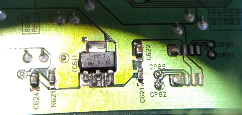 В даташите нет именно такой маркировки, а разбег по выходным вольтажам приличный - 1.2/1.8/2.5/2.85/3.0/3.3 о_О Находил темы в интернете, но нигде конкретики нет. Полезным показался этот коммент "Выходное напряжение зависит от номинала резисторов, подключенных к ноге ADJ." , но какой-то конкретики он не добавил, т.к. в даташите к ноге ADJ привязывают только сопротивление в 120 Ом, а в моем случае к ADJ, через конденсатор, идет резистор на 2 Ом (он прямо рядом с LD1117), а напрямую ADJ упирается в резистор R648 (на фото слева от процессора), который имеет 1800 Ом и уходит в процессор.