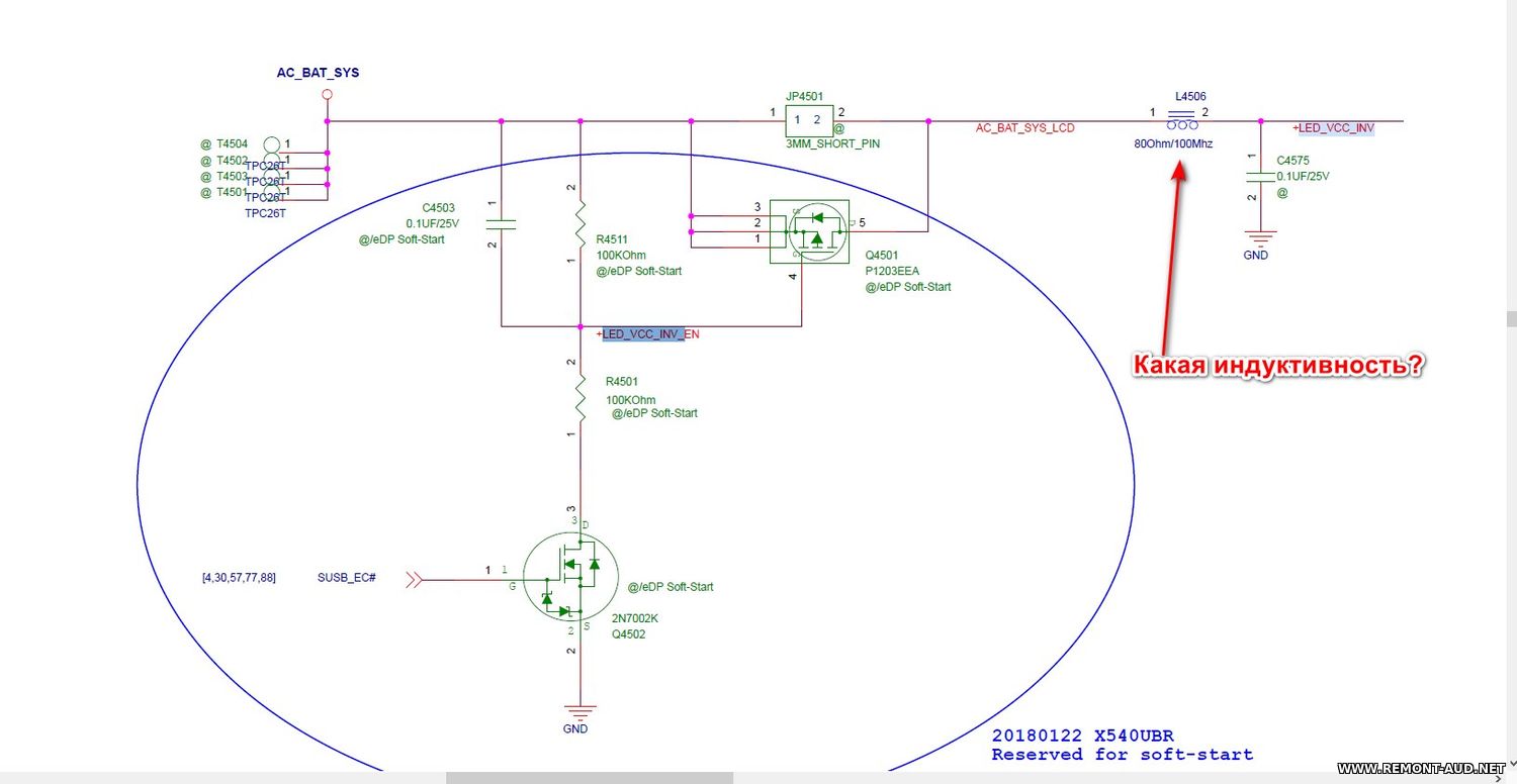 Найден обрыв дросселя L4506 (и одна сторона дросселя отвалилась от платы при малейшем прпкосновении), напряжение до дросселя AC_BAT_SYS_LCD = 11В от АКБ.