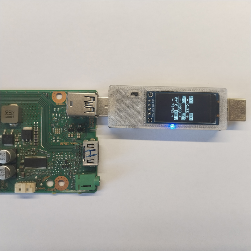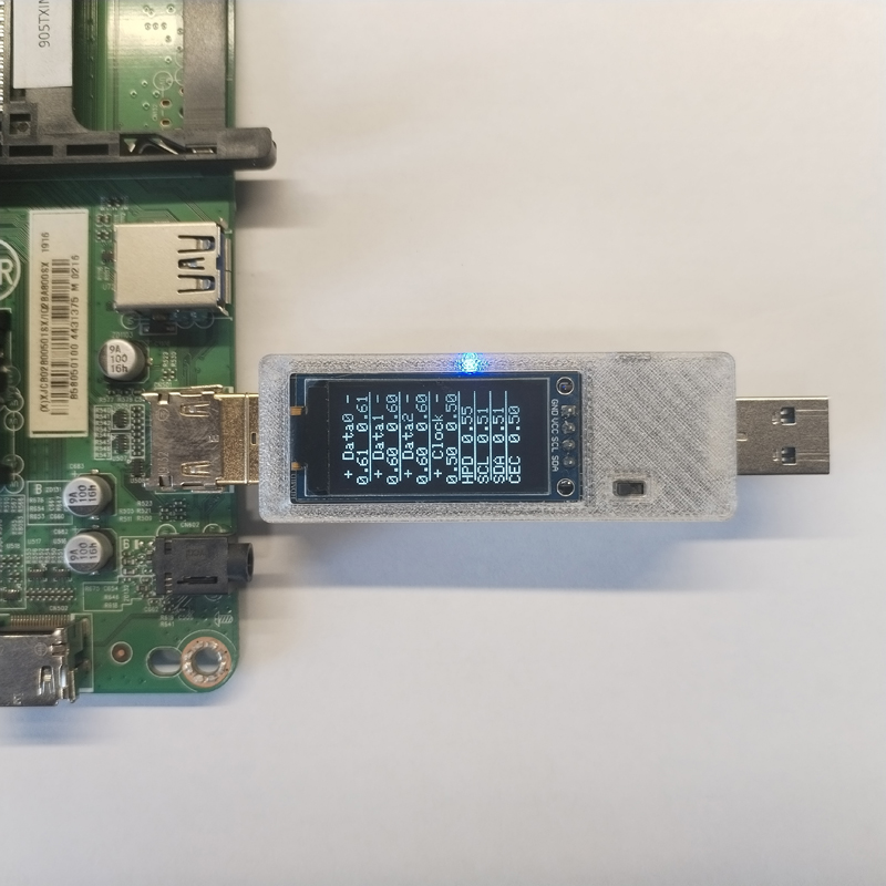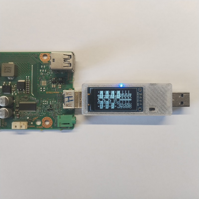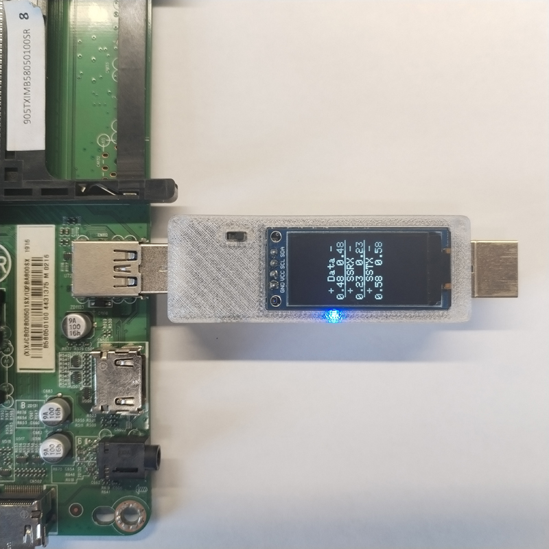 Предназначен для ремонта и экспресс диагностики игровых приставок, телевизоров, компьютеров, ноутбуков, всё что имеет разъём USB и HDMI без разбора аппарата. Позволяет проверять дифференциальные пары на обрыв (например повреждение разъёма, замыкания относительно минуса (выход из строя трансмиттера или хаба) и прохождение инициализации. Имеет 2 разъёма для проверки линий данных HDMI и USB 3.0, переключатель режимов работы (проверка инициализации переключатель в сторону разъёма USB и проверка линий данных переключатель в сторону дисплея), USB предназначен для проверки инициализации, проверки падения напряжения на линиях данных, и заряда аккумулятора. HDMI разъём предназначен для проверки линий data, clokc, i2c и других линий на падение напряжения. При проверке линий данных на дисплей выводится информация падения напряжения и если имеется обрыв (CUT) или короткое замыкание (SHRT) выводятся соответствующие надписи, при проверке инициализации выводится надпись initialization successful и издаётся звуковой сигнал. Три светодиода обозначают: красный заряд аккумулятора, зелёный аккумулятор заряжен, синий включение USB тестера.