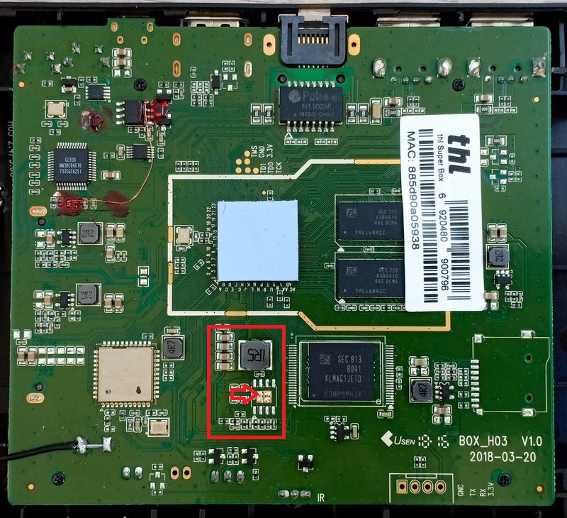 *Деталюха* стоит с обратной стороны выделенной области? Походу ШИМ-ка, работающая на дросселек 1.5мкГн. И место выделенное стрелочкой, как-бэ намекает, что вместо непонятной DFN могло стоять нечто более распространенное в корпусе SOP8. Осталось только подобрать подходящую *по ногам*. Вот тока выходное напряжение сначала вычислить ннада