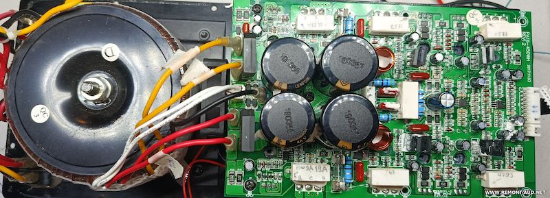 Мои познания в ремонте данного вида техники: Любитель (делаю только для себя) Наличие схемы: Нет Вот такая незатейливая вещица пришла, после двух мастеров, к сожалению. Некоторые элементы выпаивались, возможно, резисторы впаивались/менялись на то, что под рукой было, U3 отсутствовала, на транзистор прикручен радиатор и тд. Написан класс H, хотя, судя по обмоткам трансформатора, все же G. Не будем вдаваться. Что было с аппаратом изначально, достоверно неизвестно. Вроде как не было ВЧ, потом… и НЧ не стало. По запискам мастера "сигнал проходит первые пару секунд, потом пропадает (по осциллографу)". Ну,те, пока на операционнике и компараторе не встало питание. В общем, у меня из работающего на момент включения – кулер. Запитал это дело от мягкой сети ~90В. Соответственно, питание получилось, грубо, +/- 17В на предохранителях, перекоса нет. На ВЧ постоянка 0…9В, на НЧ 2В. На выходе компаратора была пляска. Она же на выходных ВЧ транзисторах. Заменил. Постоянка с ВЧ ушла. Поставил операционник, исходя из записей предыдущего мастера. Постоянка на НЧ выросла с 2В до 5В. Питание опреционника перекошено: -12/+8В. «Проходиждение сигнала», видимо от стрелочек на разъеме, не смотрел. Полупроводники, судя по количеству тыканий, проверены по десятому кругу. Компоратор U4 - LM393, операционник U3, из тех же записей, вроде как N5532. Следы флюса на резисторах R17, R15. R17 мало волнует, это вход, через рядом стоящий конденсатор и на разъем, к стрелочкам. Может, кому попадалась такая схемотехника? На предмет наличия схемы? Весь аппарат стоит 40к, если там и еще входной модуль поумирал, вместе с MP3 и FM, то прям и не знаю.