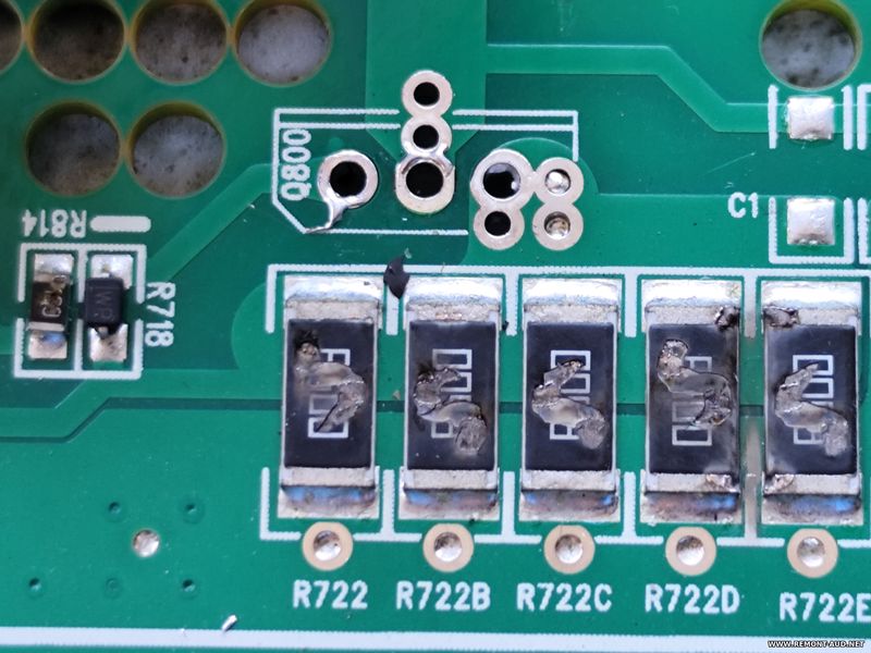 So also seem ther is fault in the build of the psu, the drain resitors sigla R000 (5 in paralel) all burned out (see foto) to me shuld be 1 ohm 1R00 so 1ohm/5=0.2ohm in total for drain current and feedback voltage for pwm. also cant identify one capacitor value because is destroyed some other capacitors also changed value so i replaced.