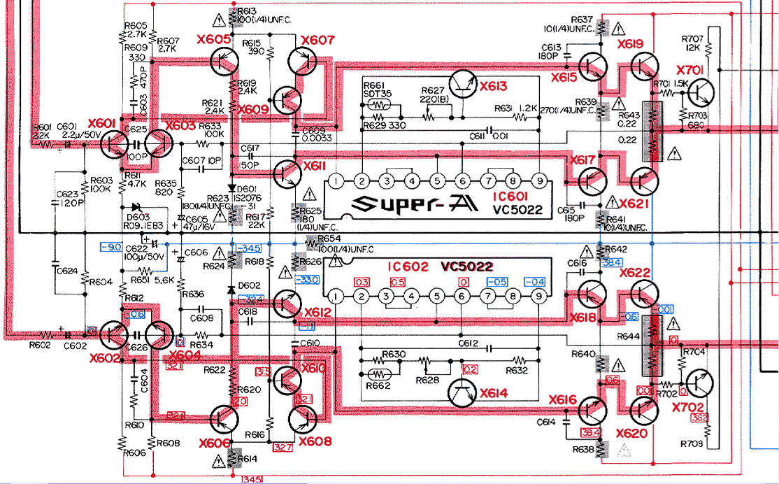 После долгих раздумий и обдумываний встал осцилом (режим AC) на коллекторы транзисторов X601 и X602. Подал 1кГц синус, с X602 выходит вся синусоида а вот с X601 только нижний полупериод....на базы транзисторов приходит нормальный синус, транзисторы целые, оба.