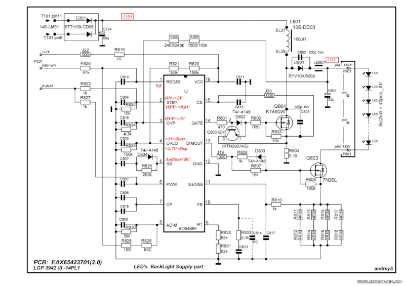 Здравствуйте. В телевизоре менялась подсветка 3 года назад. Доработан ток с помощью ув. сопротивления в датчике тока до4.3 ома. Спустя 3 года он вновь у меня. При старте телевизора, при включения питания в розетку , ток подсетки с 95мА падает до 9мА - картинку видно, но еле светит соответственно. Задумался о замене драйвера подсветки BD9486F. Но тут при проверки выяснилось, что транзистор в датчике тока не рабочий Q803. По схеме, которую нашёл на просторах, написано, что там стоит 7N20L, но в корпусе sot-23 , то есть в таком виде, я его не нашёл. Вопрос: Что туда можно поставить в таком корпусе, ибо боюсь поставить не то по параметрам? И что посоветуете менять транзистор и драйвер подсветки сразу или ограничится транзистором? Схема подсветки:
