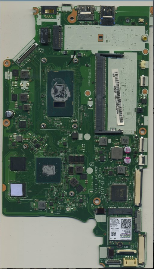 Скан платы в высоком разрешении 1200DPI Ноут - Acer A517-51G Платформа - C5V01 la-e892p rev 1.A Комбайн - SR342 (Intel Core i5-7200U) Видяха - N16S-GTR-S-A2 (NVIDIA GeForce 940MX) Мульт - KB9022QD Фото платы la-e892p