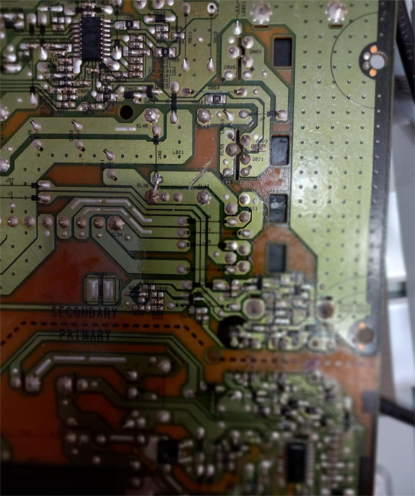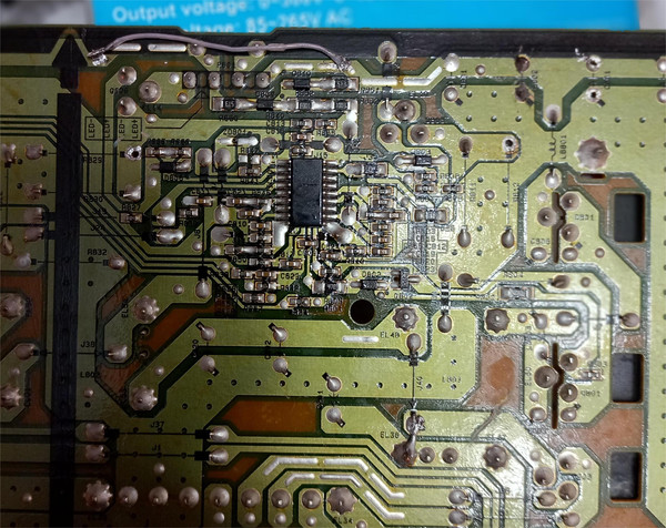 Экран посинел. Поставил новые планки подсветки и радовался правильным цветам, но через месяц подсветка стала мерцать. Неисправных деталей не нашёл. Подсветка состоит из двух каналов с раздельным питанием. На один подаётся 20 вольт, на другой 42 вольта. Что сделал : 1. Ограничил ток подсветки выпаяв пару резисторов R812 и R829 ; 2. Оба канала запитал от 20 вольт ; 3. Оба канала запараллелил . Вся работа на фото