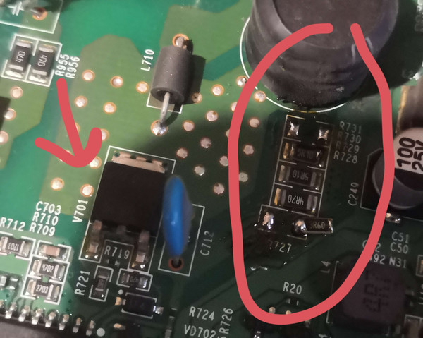 Драйвер собран на микросхеме HOZ1GN, для ограничения тока необходимо удалить один или несколько резисторов в группе на истоке транзистора v701 (R727-R731)