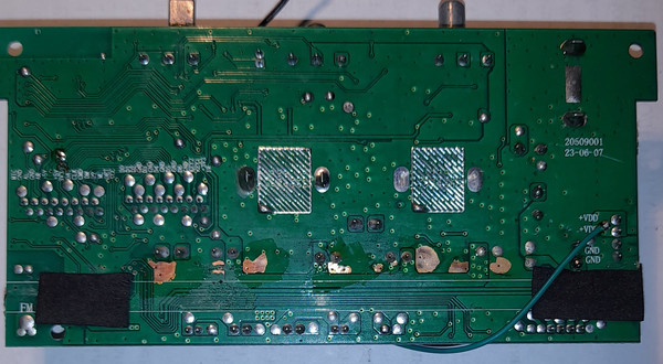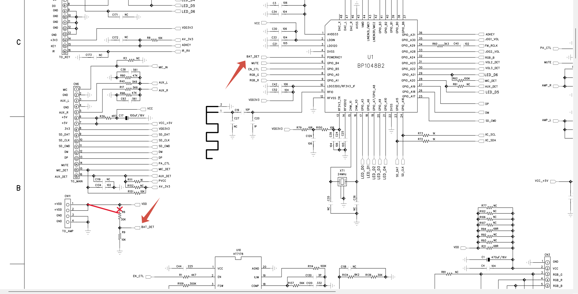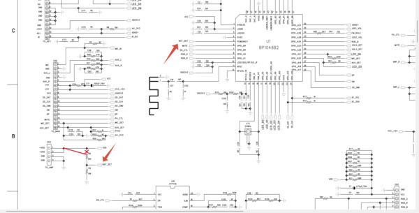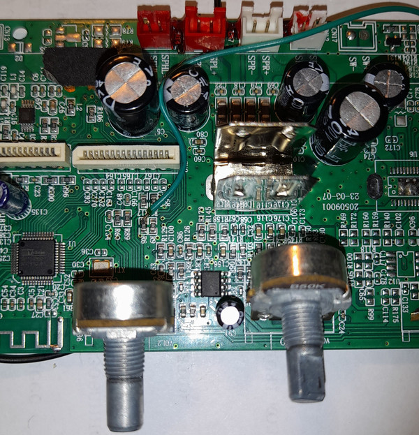 Все платы и разъемы очистил, проверил аккумулятор и его зарядку. Включил колонку и тоже самое - OFF - четыре штриха - отключение. Схему колонки нашёл на данном ресурсе, спасибо участнику Inglar. Напряжение на пятой ноге процессора отсутствовало, что подтвердило мою догадку о срабатывании защиты при критическом разряде аккумулятора. Напряжение установленной составной литиевой батареи 5,6...8,4В, то есть на делителе, а значит и на пятом входе должно составлять 1,4...2,1В. Прозвонкой дорожек, выявил разрыв между шинкой VDD и R6 в месте перехода между сторонами платы (влагой "съело" гильзу). Установил перемычку между разъёмом CN11 (+VDD) и сопротивлением R6 (см. схему и фото платы). Включил колонку и она исправно заработала во всех режимах. Напряжение на пятой ноге процессора 2,04В при напряжении на аккумуляторе 8,1В.